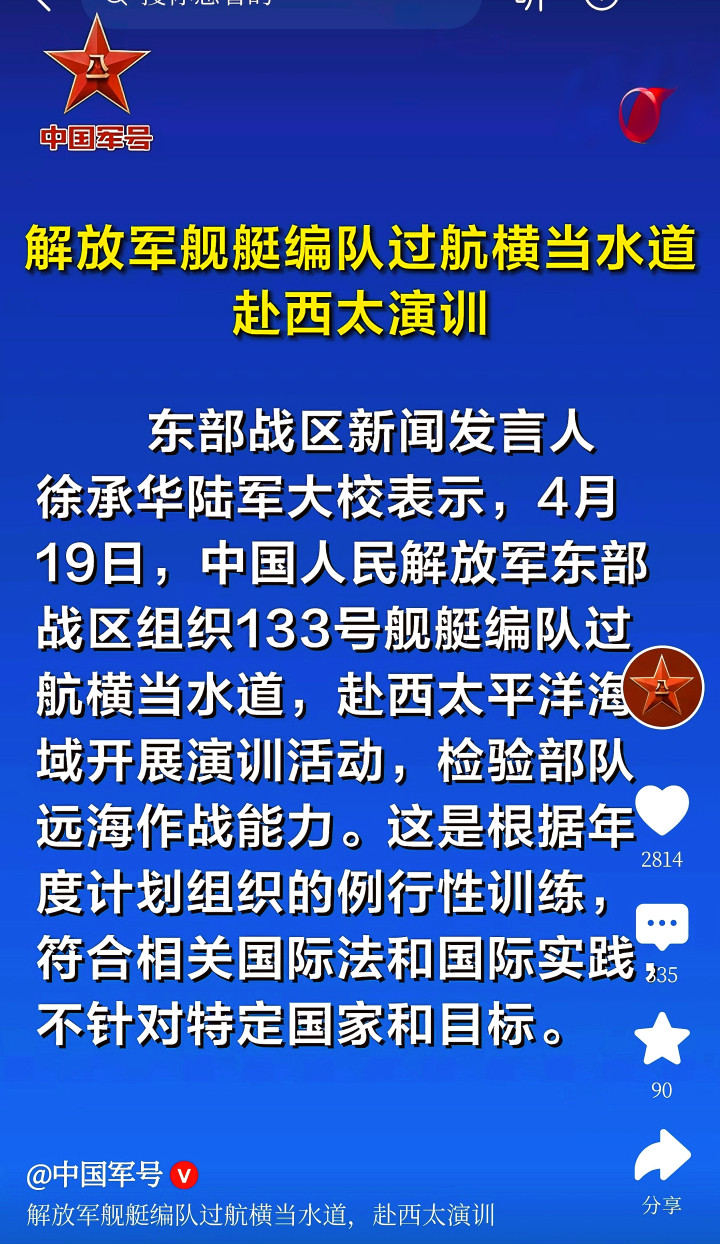 4月18日,我军率先在东海专属经济区展开行动,相当于在日本家门口“敲锣打鼓放鞭炮”,打响了反制的第一枪;仅仅时隔一天,4月19日,东部战区正式发布消息,组织133舰艇编队过航横当水道,赴西太平洋海域开展演训活动,检验部队远海作战能力。官方明确,此次演训是年度计划内的例行性训练,完全符合相关国际法和国际实践,不针对任何特定国家和目标,但明眼人都清楚,这是一场针对性极强、精准对等的“礼尚往来”。
